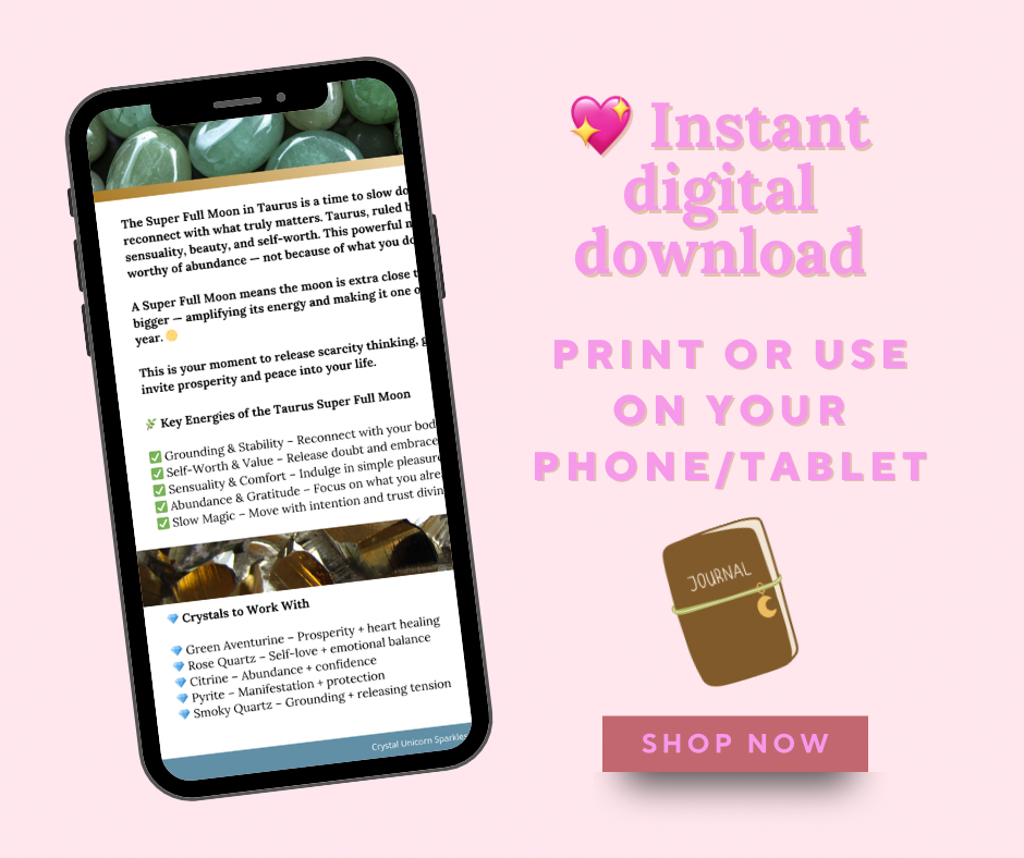 This beautifully designed digital workbook is your step-by-step moon ritual companion — perfect for a cozy night in, journaling under the moon, or creating sacred space with your crystals.